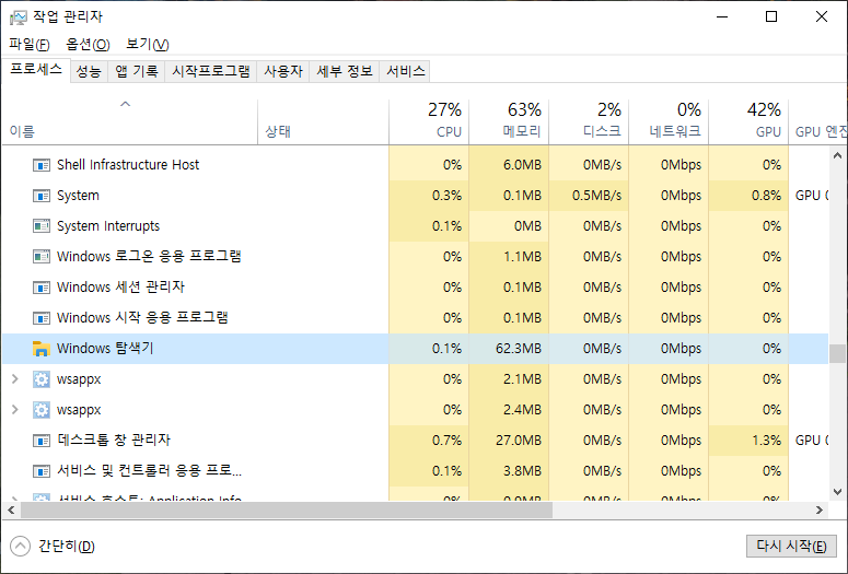 사실 로아뿐만 아니라 윈도우 탐색기 관련 버그가 있으면 이런식으로 다시시작 하면 됨